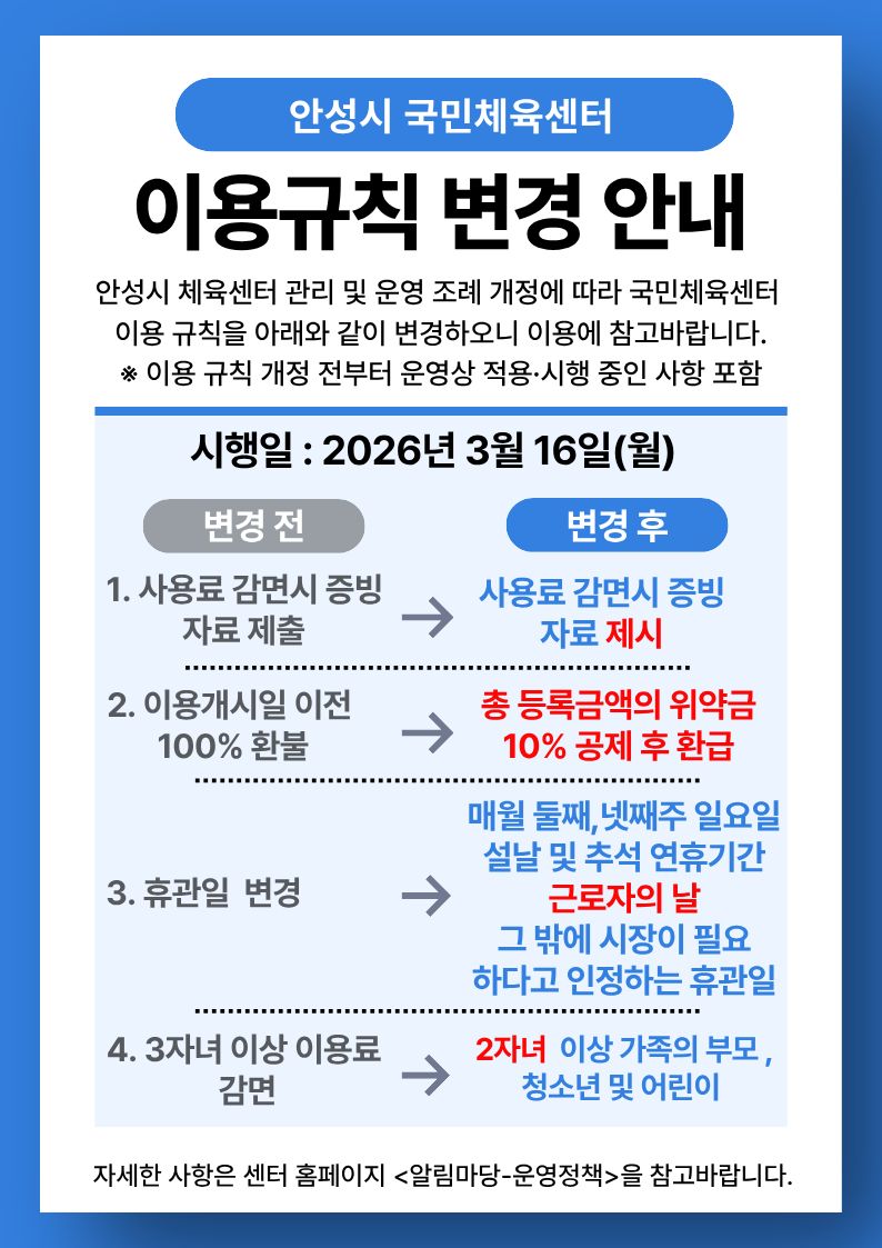 | 안성시 국민체육센터 이용규칙 변경 안내2026-03-17 | |||
