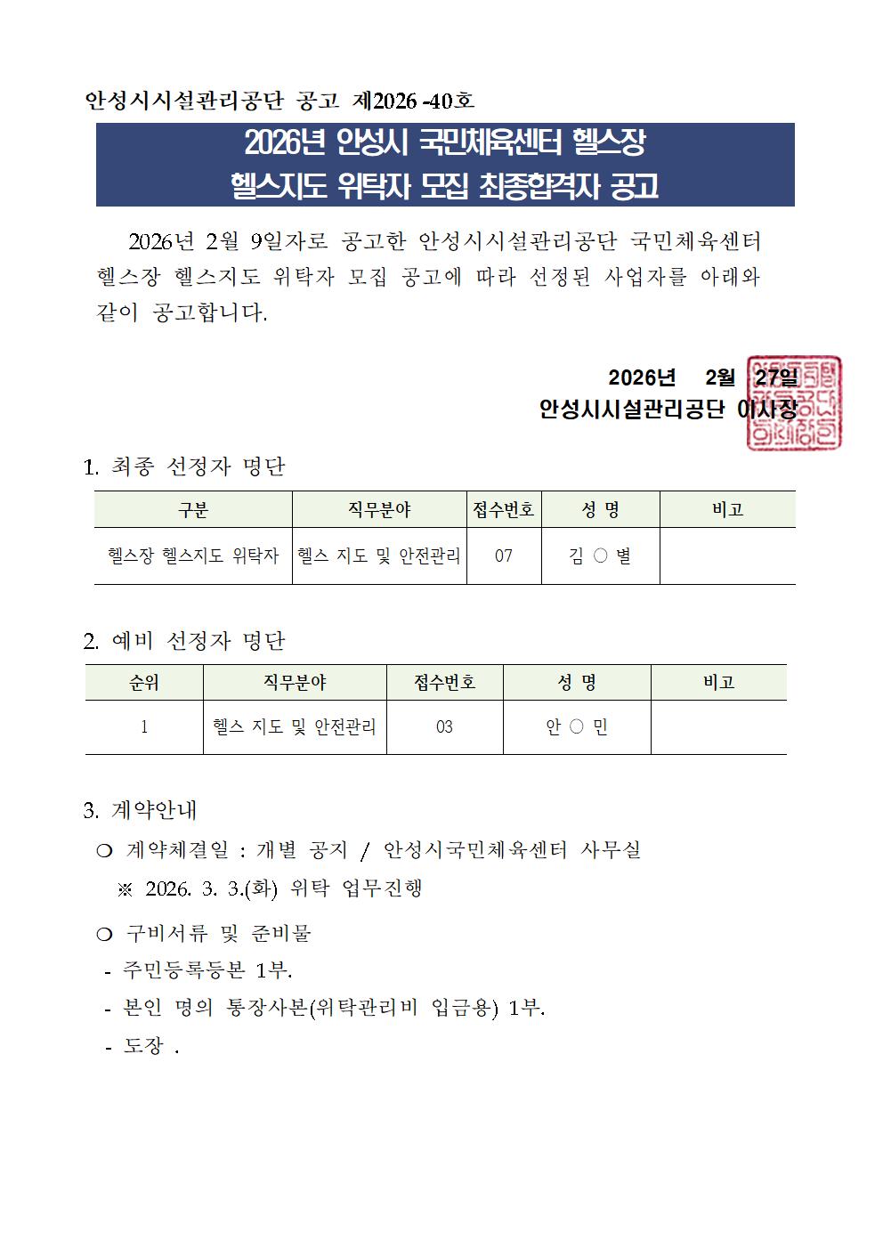 | 2026년 안성시국민체육센터 헬스장 헬스지도 위탁자 최종합격자 공고2026-02-27 | |||